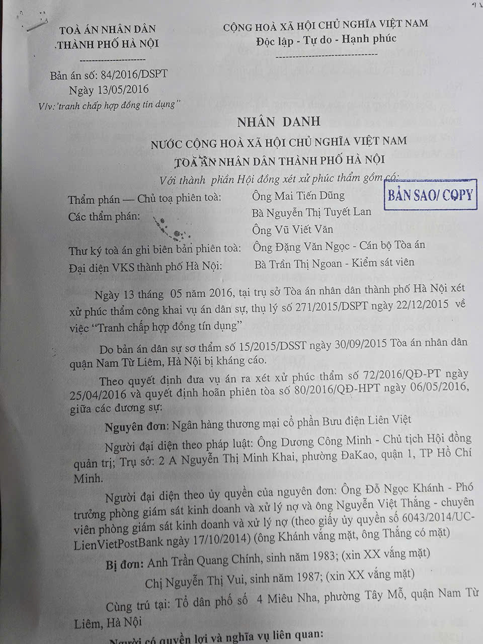 Bản án của Tòa án nhân dân TP. Hà Nội có hiệu lực từ ngày 13/5/2016 đã tuyên hợp đồng thế chấp vô hiệu, buộc ngân hàng phải trả lại Giấy chứng nhận quyền sử dụng đất cho gia đình ông Ch.